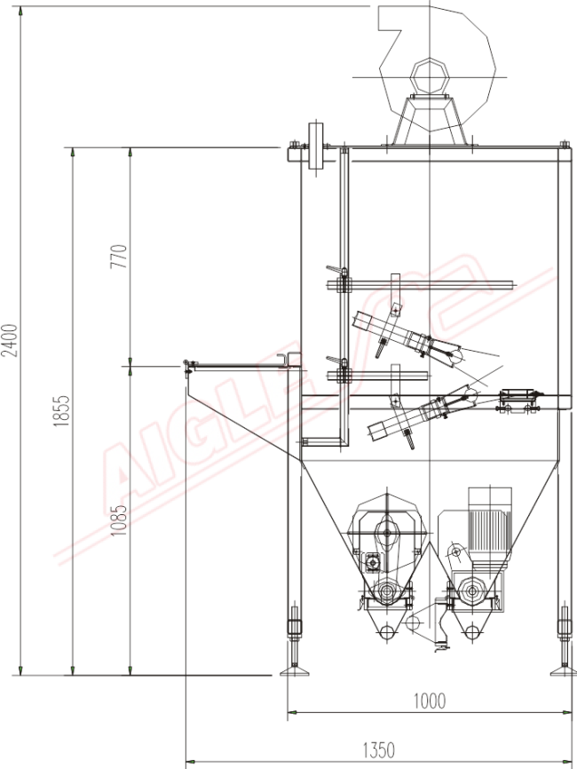 – Containing/dosing group: it is a special flock container located in the lower part of the machine. Two motorized screws equipped with two speed variators are placed at its base; they feed flock in a constant and adjustable way to two air/flock mixers. A scattering device inside the container prevents the formation of flock bridges. Air/flock mixture is obtained with a special fan. Flock is transported through two flexible pipes and up to the two spraying groups located in the upper part of the machine.