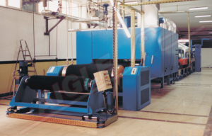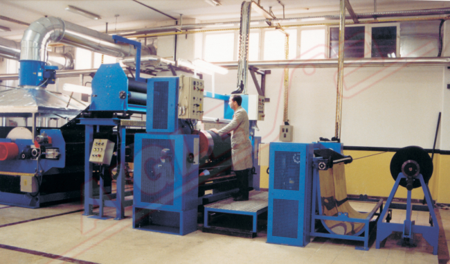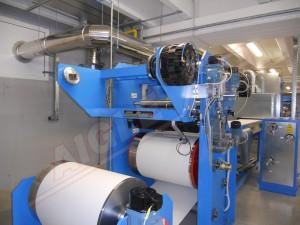 MOVING UNWINDER, mounted on wheels and running on rails. It can be placed before the first heating cylinder and unwound material that requires lamination, or after the second heating cylinder and therefore functions as a “Dry-Coat” unit